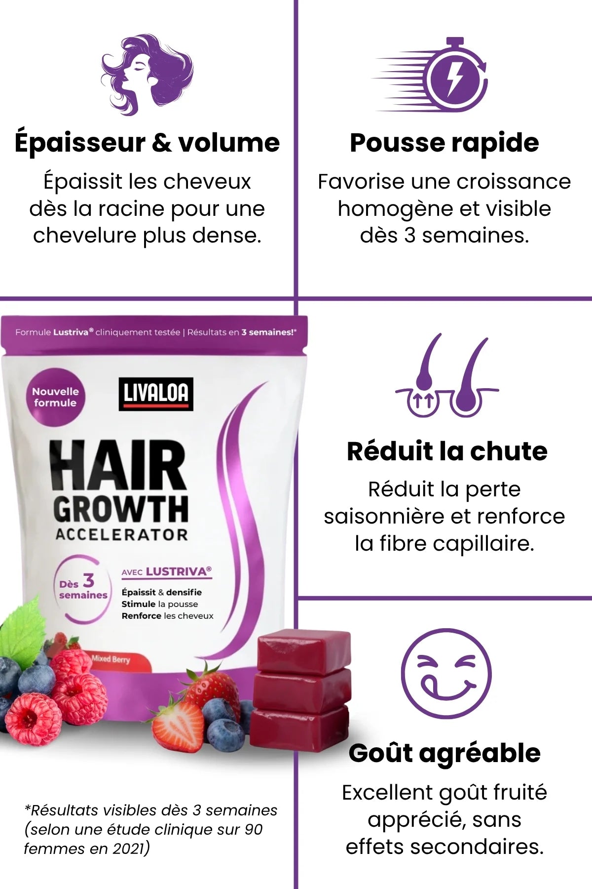 Son efficacité a été démontrée dans une étude clinique en double aveugle menée sur 90 femmes : une augmentation significative de l’épaisseur des cheveux a été observée dès 3 semaines, comparée au groupe placebo.