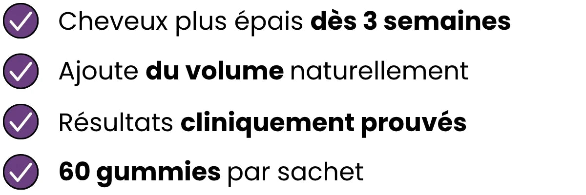 La plupart de nos clientes remarquent des cheveux plus denses et plus forts dès 3 semaines.